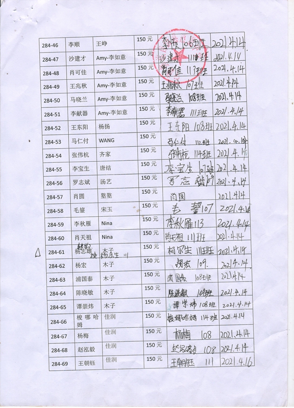 第284批蒗渠中学(2021年3月-2021年8月)受助学生签字确认单