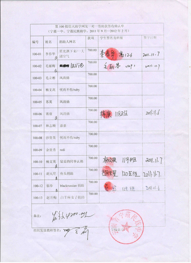 宁蒗一中第100批(2011.9-2012.2)受助学生签字确认单(剩余学生领款):