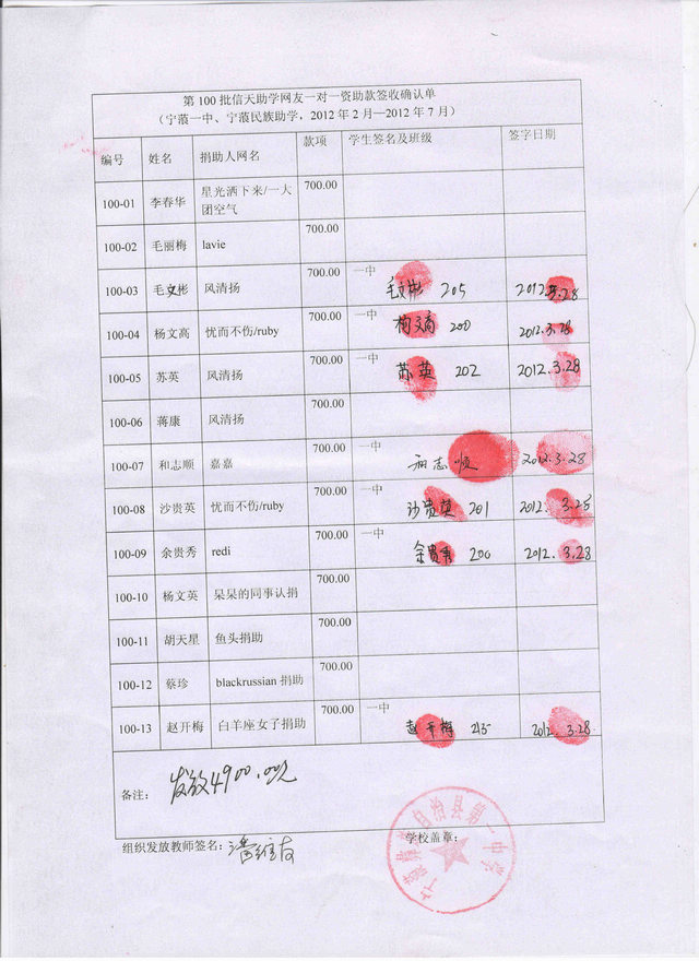 宁蒗一中、宁蒗民中第100批(2012.3-2012.7)受助学生签字确认单