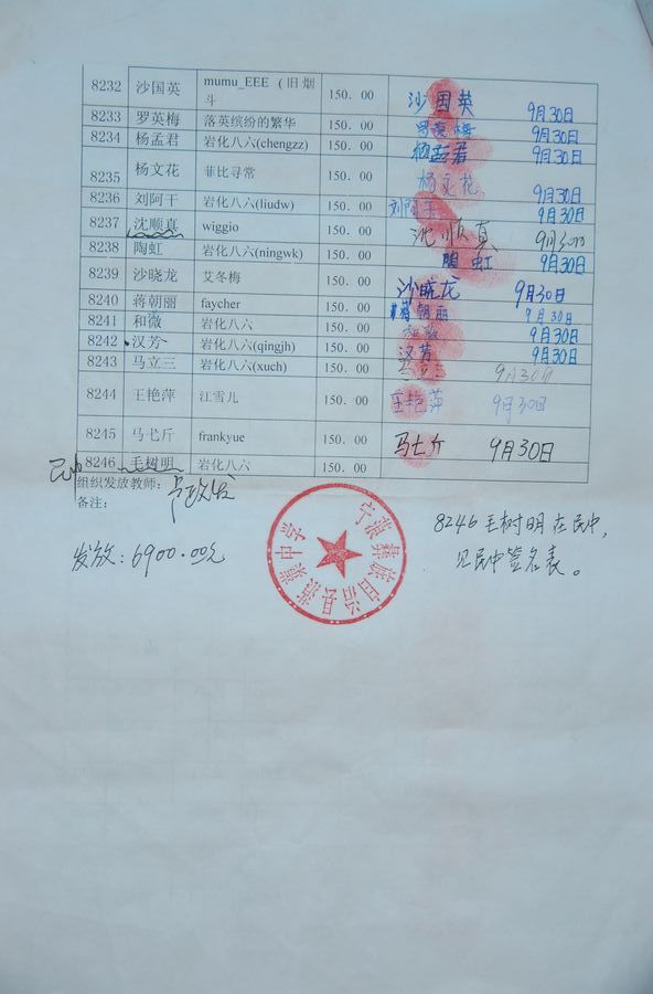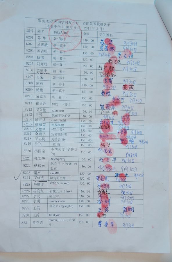 7、全部捐助款到漫步轻灵这里后,她会按学期分次汇给浦理智老师,浦理智老师和学校的负责老师再分发给受助学生(学生每学期收到150元),一一签字确认。知识改变命运,愿这些学生将来不再重复父辈们那艰辛苦难的日子。