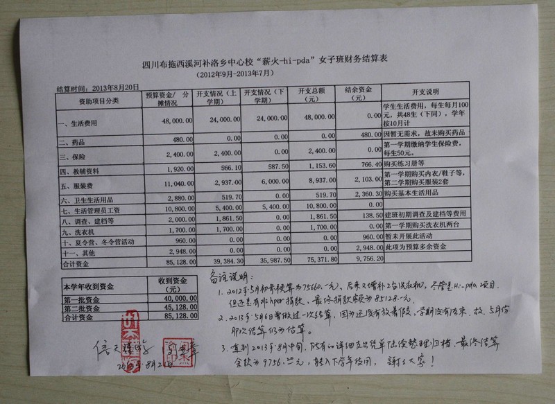 信天助学、薪火助学志愿者在2006年就开始在布拖县助学,与布拖县教育局建立了良好的合作关系,资金严格监管、使用,后面有详细的支出清单,谢谢大家。