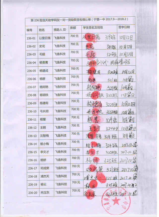 第236批宁蒗一中(2017年9月-2018年2月)受助学生签字确认单: