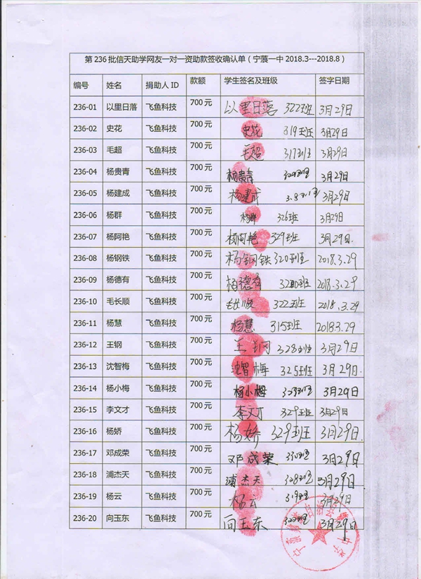 第236批宁蒗一中(2018年3月-2018年8月)受助生签收单