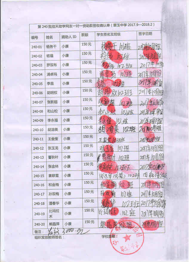 第240批翠玉中学(2017年9月-2018年2月)受助生签收单