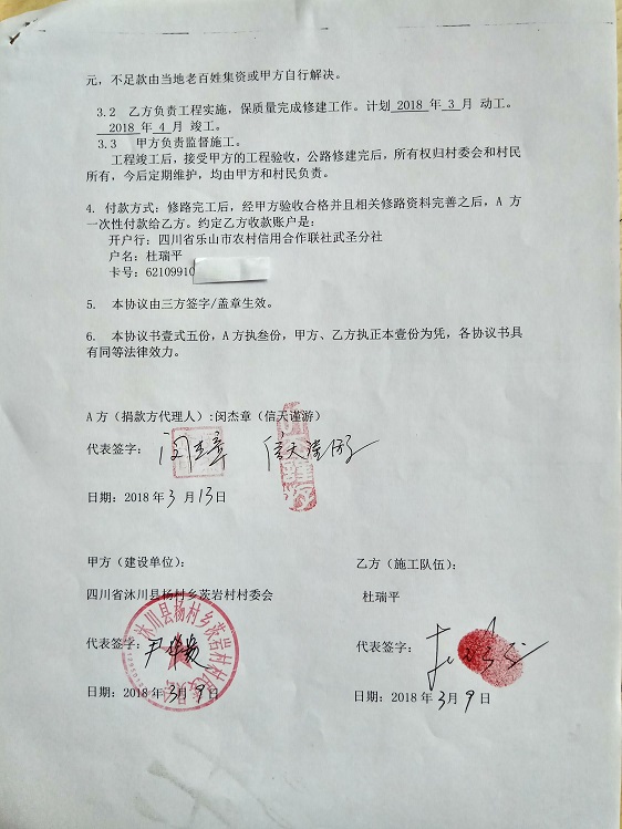 (1)爱心人捐款、村民投工投劳一起修土路,干季可以通车;