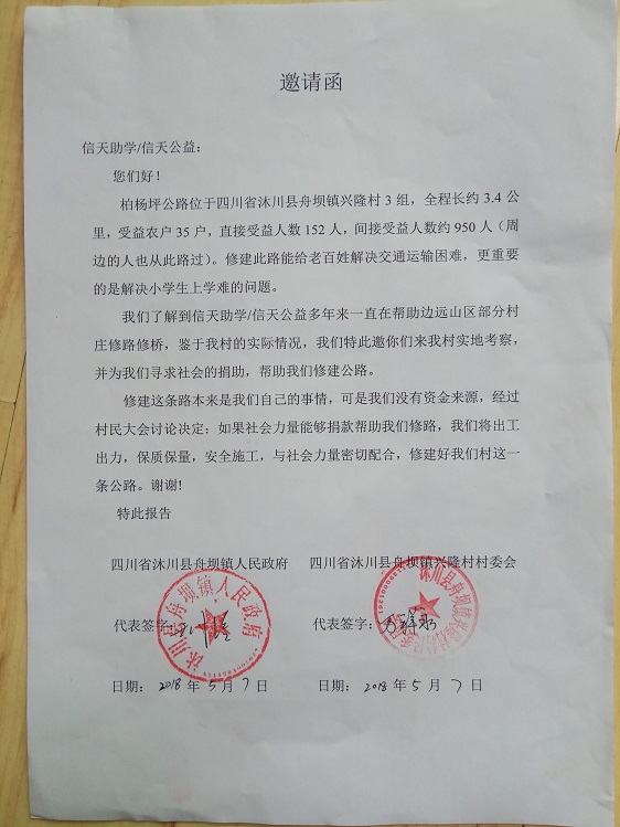 柏杨坪公路位于四川省沐川县舟坝镇兴隆村3组,全程长约3.4公里,起点:核桃树屋基,终点:柏杨坪,受益农户35户,直接受益人数152人,间接受益人数约950人(周边的人也从此路过)。修建此路能给老百姓解决交通运输困难,更重要的是解决小学生上学难的问题。村民修路决心很大,全力集资,350元/户,共集资12250元,计划修通土路、支路、涵管、并铺设部份路面块石,力争雨季也能通车。