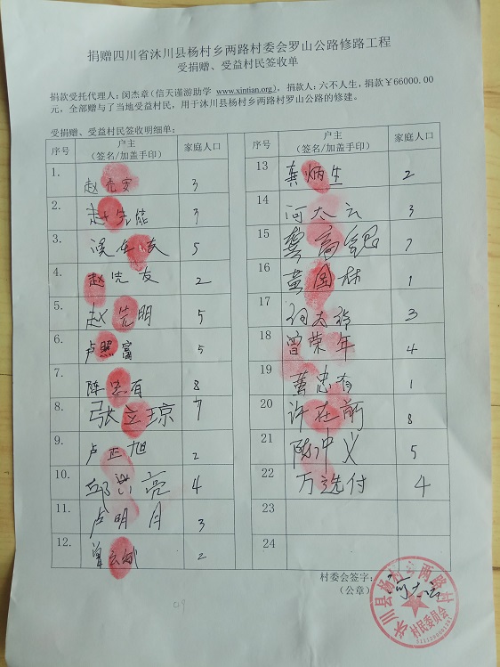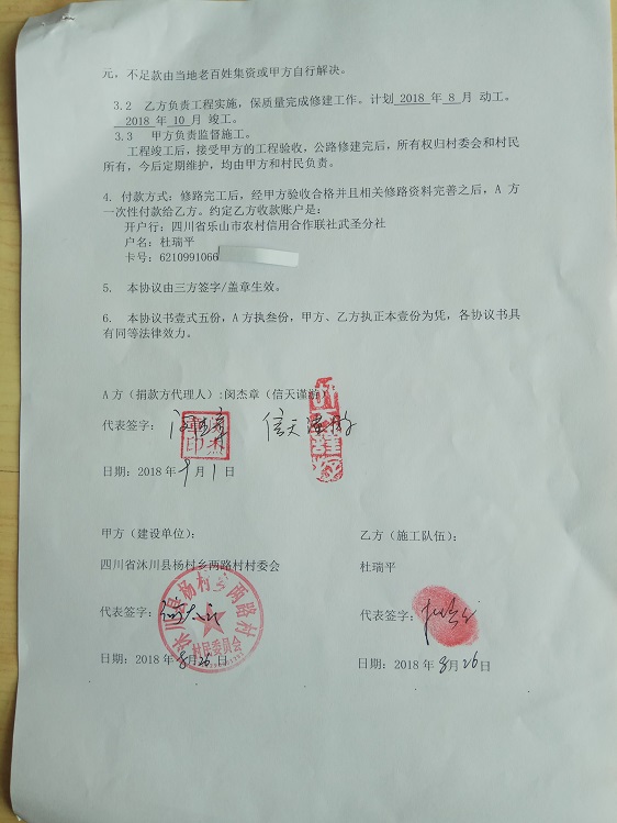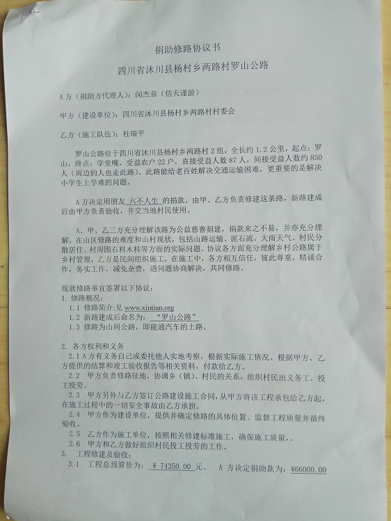 六不人生,2018.06.26支,竣工,此款是由六不人生原来备用捐修龙相幼儿园宿舍的补充款,后因杭州公司捐了,改在修路,六不人生说改用修路,故修此路。
