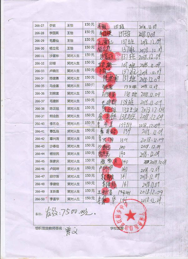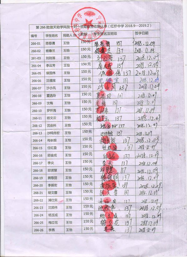 第266批红桥中学(2018年9月-2019年2月)受助学生签收单