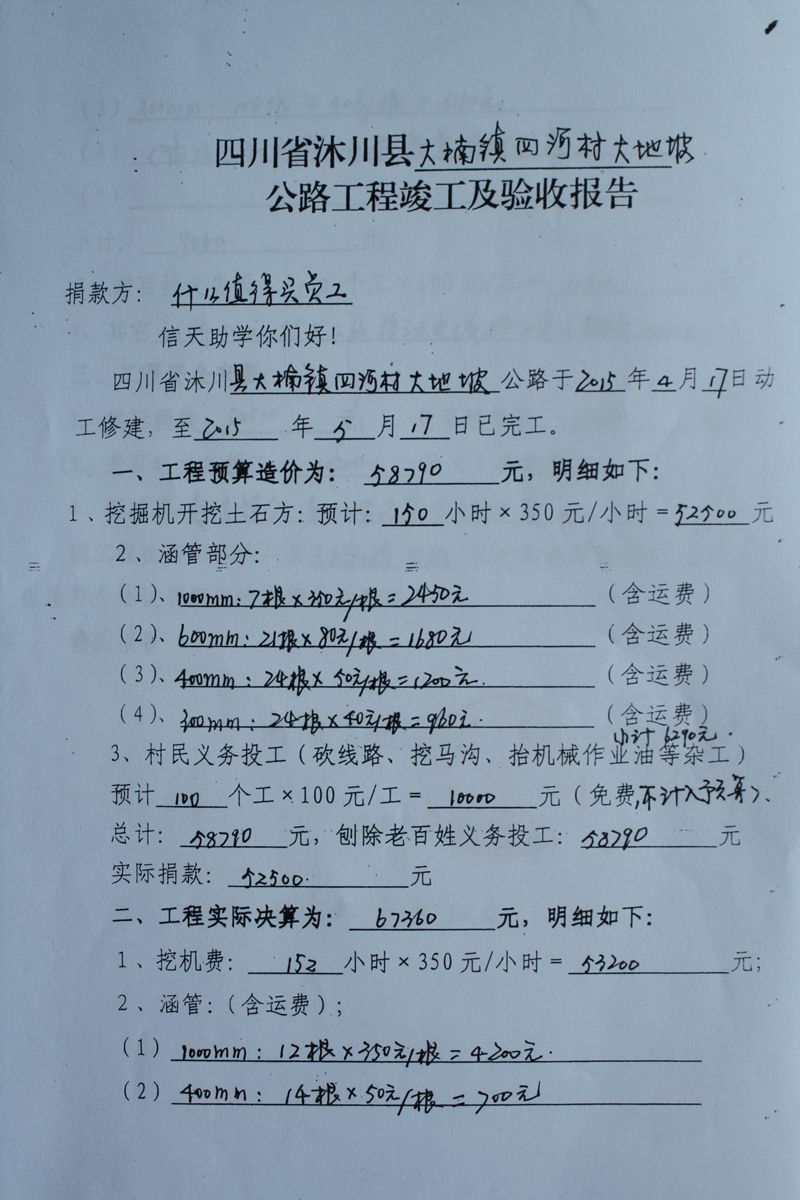 (5)修路预算分好几部分,有挖掘机、涵管、炸药爆破(山崖需要爆破)、堡坎、村民义务工、征地等。修路,我们不全包,我们出一大部分钱:挖掘费用、山崖爆破等。村民出义务工、涵管、征地费、村民小额集资。