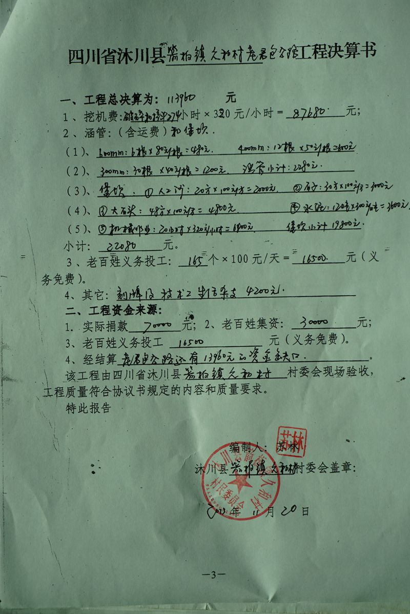 (5)修路预算分好几部分,有挖掘机、涵管、炸药爆破(山崖需要爆破)、堡坎、村民义务工、征地等。修路,我们不全包,我们出一大部分钱:挖掘费用、山崖爆破等。村民出义务工、涵管、征地费、村民小额集资。