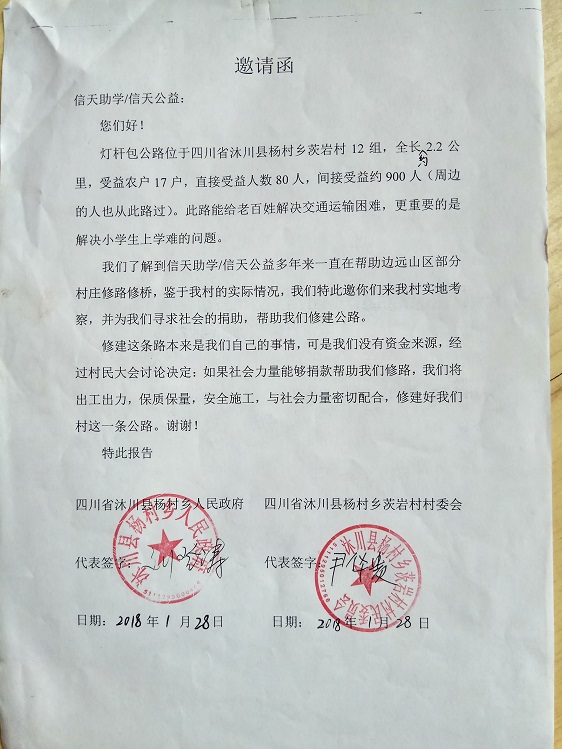 灯杆包公路位于四川省沐川县杨村乡茨岩村12组,全长2.2公里,起点:灯杆包,终点:花秋槽,受益农户17户,直接受益人数80人,间接受益约900人(周边的人也从此路过)。此路能给老百姓解决交通运输困难,更重要的是解决小学生上学难的问题。村民修路决心很大,全力集资,400元/户,共集资6800元,计划修通土路、支路、涵管、并铺设部份路面块石,力争雨季也能通车。