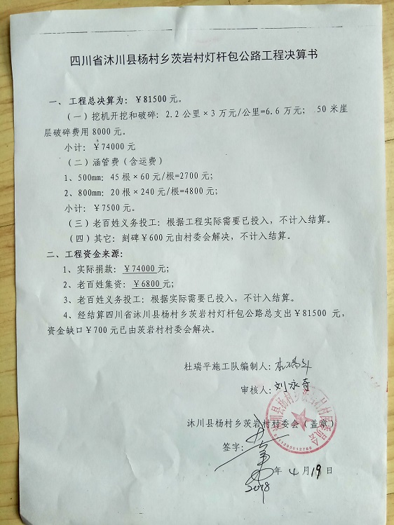 (5)修路预算分好几部分,有挖掘机、涵管、炸药爆破(山崖需要爆破)、堡坎、村民义务工、征地等。修路,我们不全包,我们出一大部分钱:挖掘费用、山崖爆破等。村民出义务工、涵管、征地费、村民小额集资。
