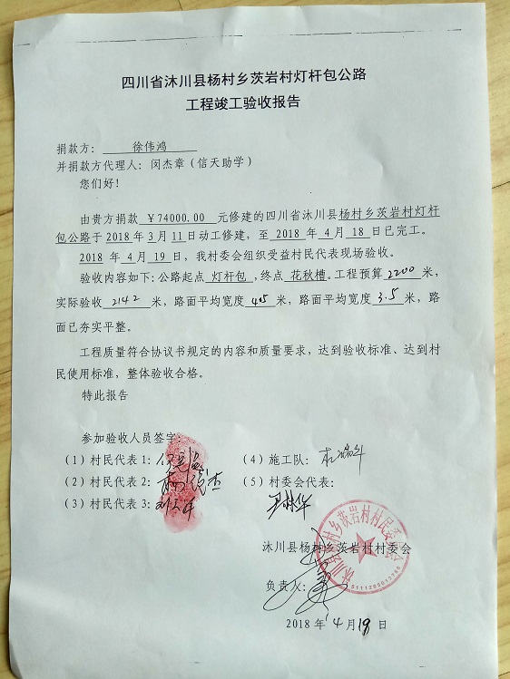 (1)爱心人捐款、村民投工投劳一起修土路,干季可以通车;