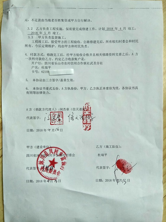 (1)爱心人捐款、村民投工投劳一起修土路,干季可以通车;