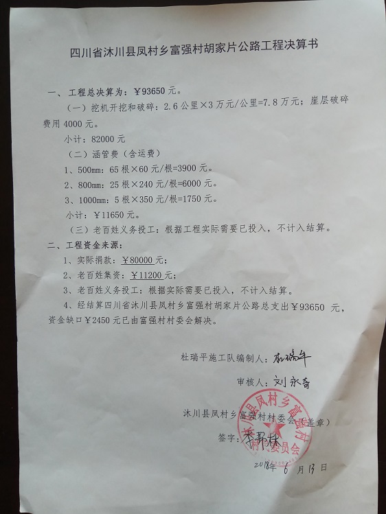 (5)修路预算分好几部分,有挖掘机、涵管、炸药爆破(山崖需要爆破)、堡坎、村民义务工、征地等。修路,我们不全包,我们出一大部分钱:挖掘费用、山崖爆破等。村民出义务工、涵管、征地费、村民小额集资。