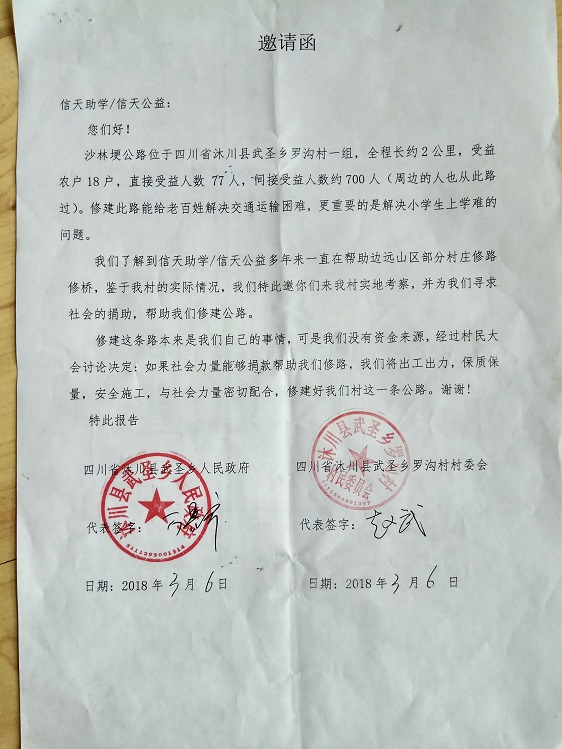 沙林埂公路位于四川省沐川县武圣乡罗沟村一组,全程长约2公里,起点:凸田头,终点:沙林埂,受益农户18户,直接受益人数 77人,间接受益人数约700人(周边的人也从此路过)。修建此路能给老百姓解决交通运输困难,更重要的是解决小学生上学难的问题。村民修路决心很大,全力集资,400元/户,共集资7200元,计划修通土路、支路、涵管、并铺设部份路面块石,力争雨季也能通车。