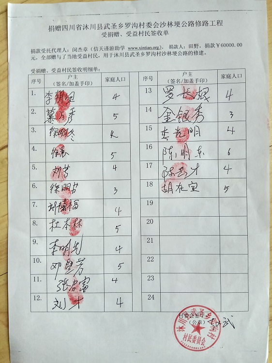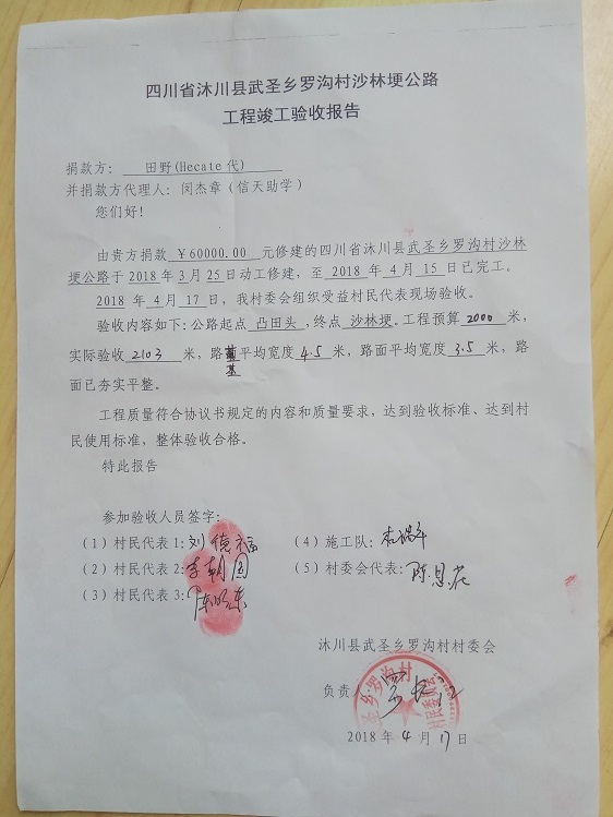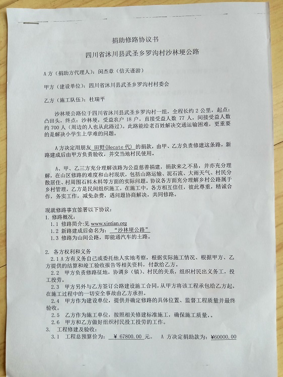 (1)爱心人捐款、村民投工投劳一起修土路,干季可以通车;