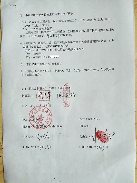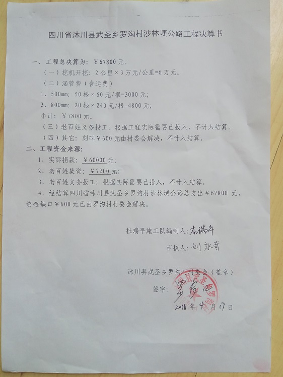 (5)修路预算分好几部分,有挖掘机、涵管、炸药爆破(山崖需要爆破)、堡坎、村民义务工、征地等。修路,我们不全包,我们出一大部分钱:挖掘费用、山崖爆破等。村民出义务工、涵管、征地费、村民小额集资。