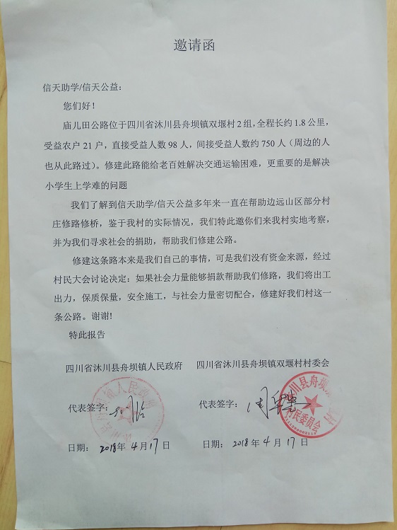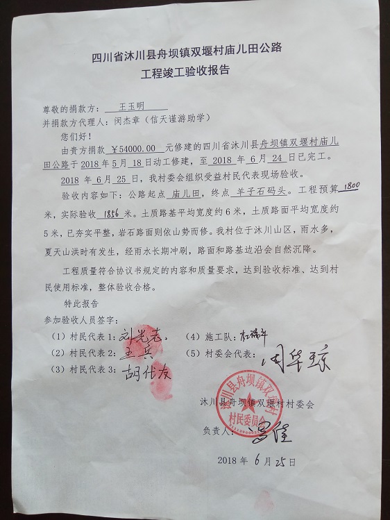 (1)爱心人捐款、村民投工投劳一起修土路,干季可以通车;