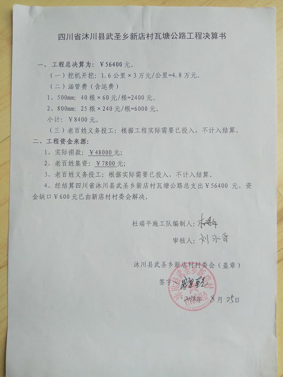 (5)修路预算分好几部分,有挖掘机、涵管、炸药爆破(山崖需要爆破)、堡坎、村民义务工、征地等。修路,我们不全包,我们出一大部分钱:挖掘费用、山崖爆破等。村民出义务工、涵管、征地费、村民小额集资。