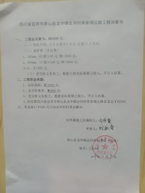 (5)修路预算分好几部分,有挖掘机、涵管、炸药爆破(山崖需要爆破)、堡坎、村民义务工、征地等。修路,我们不全包,我们出一大部分钱:挖掘费用、山崖爆破等。村民出义务工、涵管、征地费、村民小额集资。