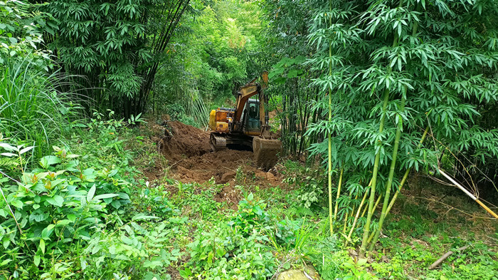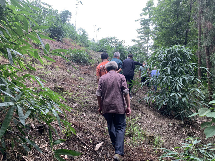 村民勘察路线,计划把这里的羊肠小道扩宽修建成能跑四轮车的乡间土质公路。