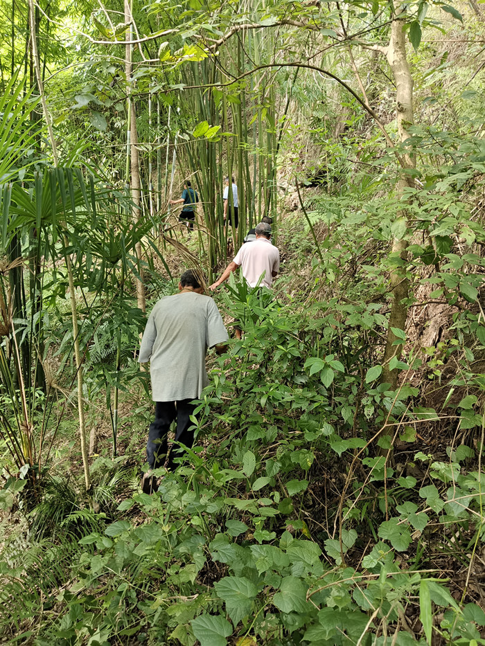 村民勘察路线,计划把这里的羊肠小道扩宽修建成能跑四轮车的乡间土质公路。