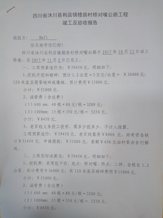 (5)修路预算分好几部分,有挖掘机、涵管、炸药爆破(山崖需要爆破)、堡坎、村民义务工、征地等。修路,我们不全包,我们出一大部分钱:挖掘费用、山崖爆破等。村民出义务工、涵管、征地费、村民小额集资。