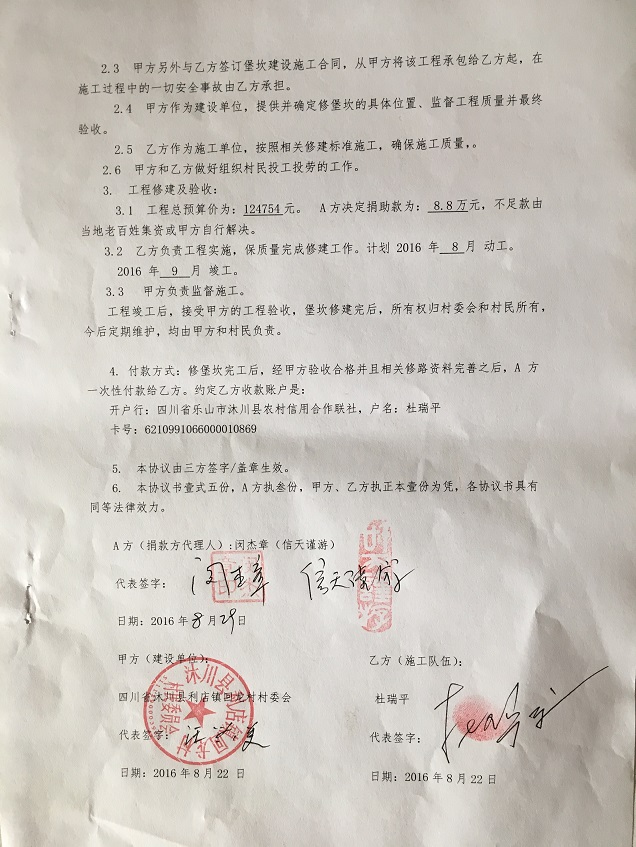 修建此路堡坎能减少交通事故,确保经过此路段的村民和学生的人生安全。村民修堡坎决心很大,全力集资,300元/户,共集资24000元(回龙村3组村民听说信天助学计划捐建此路堡坎,一天内大家就把集资款交齐了),下大决心一定修好回龙村路堡坎。