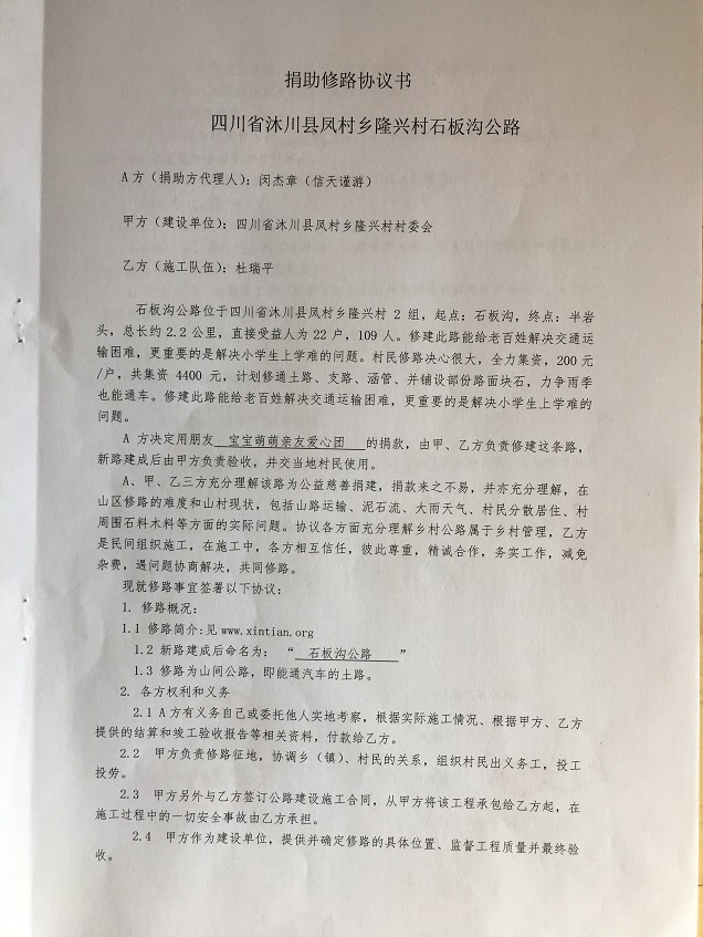 备注:(信天谨游受朋友李佳润、赵萌委托修路,留名宝宝萌萌亲友爱心团)
