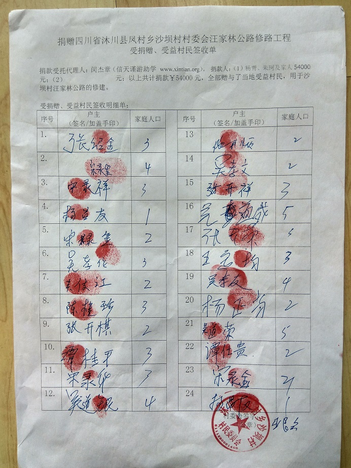 信天的朋友朱小姐捐54000元。刻牌捐款人确认为:杨青、朱珂及家人。