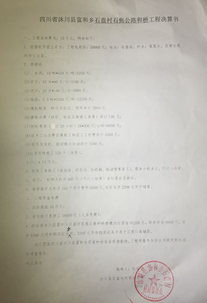 (5)修路预算分好几部分,有挖掘机、涵管、炸药爆破(山崖需要爆破)、堡坎、村民义务工、征地等。修路,我们不全包,我们出一大部分钱:挖掘费用、山崖爆破等。村民出义务工、涵管、征地费、村民小额集资。