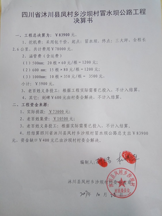 (5)修路预算分好几部分,有挖掘机、涵管、炸药爆破(山崖需要爆破)、堡坎、村民义务工、征地等。修路,我们不全包,我们出一大部分钱:挖掘费用、山崖爆破等。村民出义务工、涵管、征地费、村民小额集资。