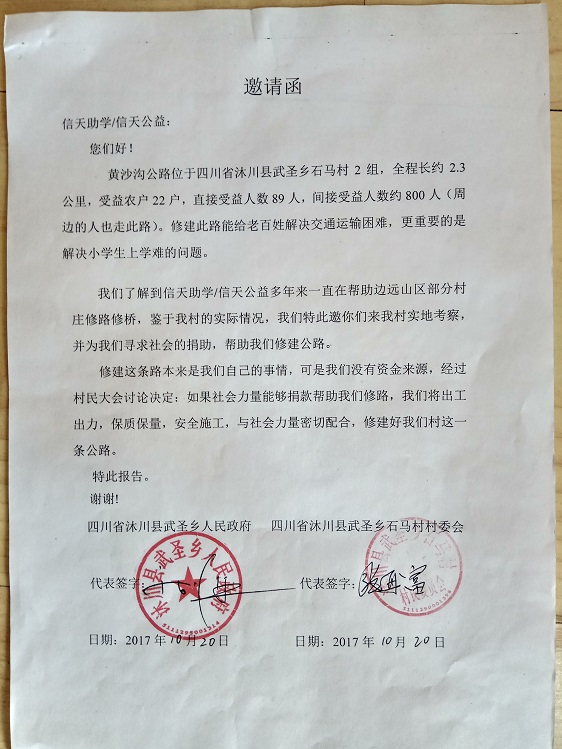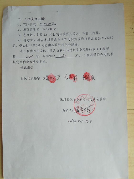 黄沙沟公路位于四川省沐川县武圣乡石马村2组,起点:马道子,终点:黄沙沟,全程长约2.3公里,受益农户22户,直接受益人数89人,间接受益人数约800人。修建此路能给老百姓解决交通运输困难,更重要的是解决小学生上学难的问题。村民修路决心很大,全力集资,450元/户,共集资9900元,计划修通土路、支路、涵管、并铺设部份路面块石,力争雨季也能通车。