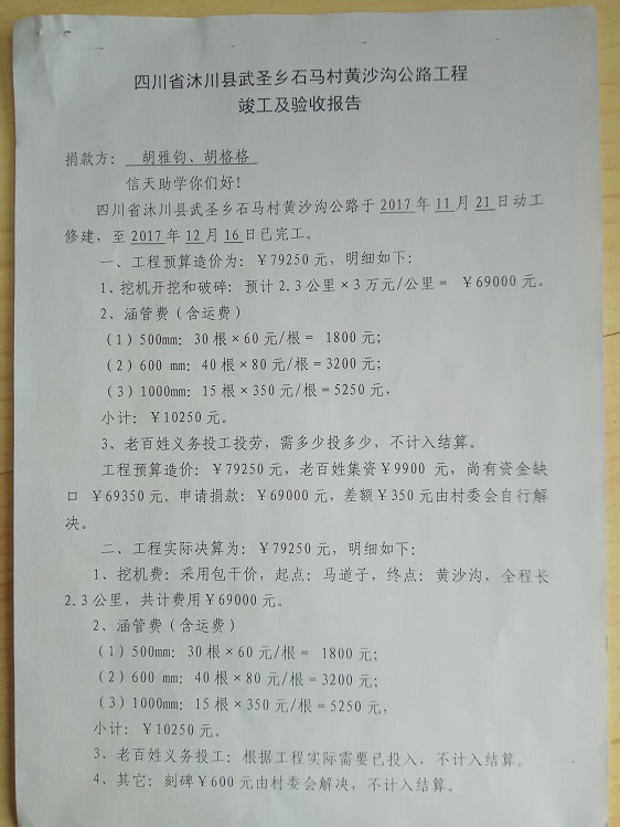 (5)修路预算分好几部分,有挖掘机、涵管、炸药爆破(山崖需要爆破)、堡坎、村民义务工、征地等。修路,我们不全包,我们出一大部分钱:挖掘费用、山崖爆破等。村民出义务工、涵管、征地费、村民小额集资。