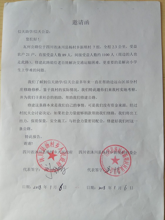 瓦何公路位于四川省沐川县杨村乡新坝村7组,全长2.3公里,起点:瓦寨子,终点:何家湾,受益农户21户,直接受益人数89人,间接受益约1100人。此路能给老百姓解决交通运输困难,更重要的是解决小学生上学难的问题。村民修路决心很大,全力集资,400元/户,共集资8400元,计划修通土路、支路、涵管、并铺设部份路面块石,力争雨季也能通车。