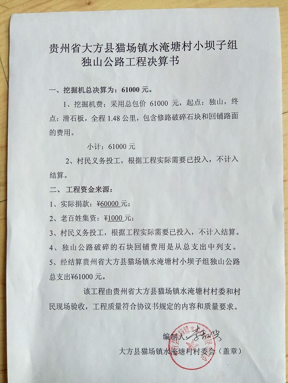 (5)修路预算分好几部分,有挖掘机、涵管、炸药爆破(山崖需要爆破)、堡坎、村民义务工、征地等。修路,我们不全包,我们出一大部分钱:挖掘费用、山崖爆破等。村民出义务工、涵管、征地费、村民小额集资。