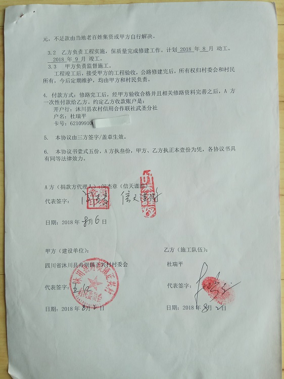 (5)修路预算分好几部分,有挖掘机、涵管、炸药爆破(山崖需要爆破)、堡坎、村民义务工、征地等。修路,我们不全包,我们出一大部分钱:挖掘费用、山崖爆破等。村民出义务工、涵管、征地费、村民小额集资。