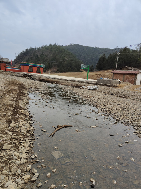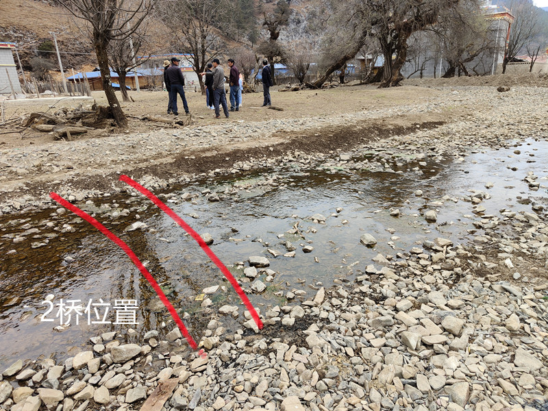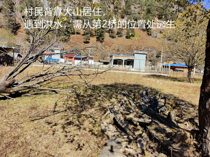 村民背后是大山,另外三面,上面是上游(有一座桥),遇到洪水,无法向上游逃生,另外两面环河,在河上计划修建小桥。