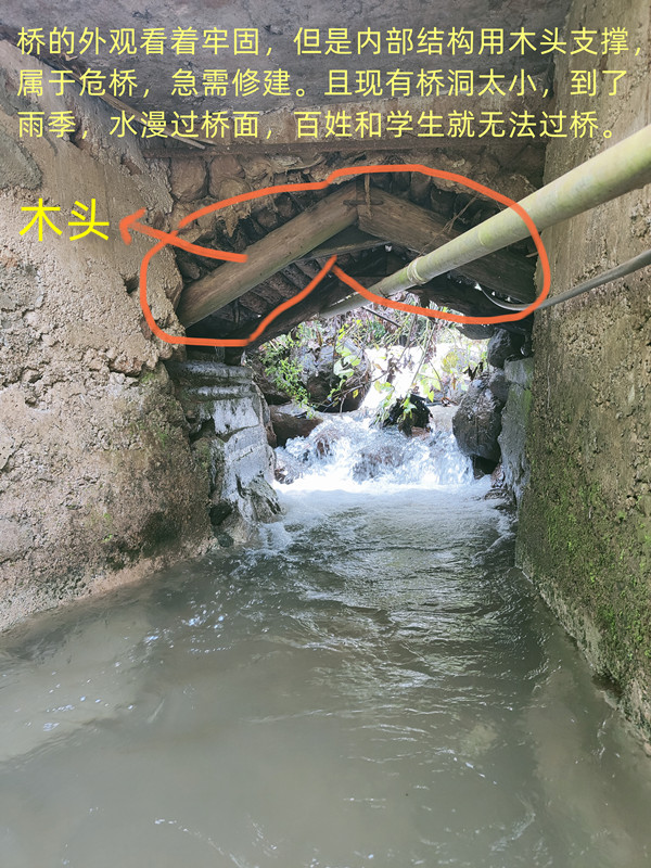 现在路上有一座小桥,外观看着还行,可是桥洞里面用木头支撑,属于危桥,另外桥洞太小,到了雨季洪水下来,雨水漫过桥面,村民和学生就无法通行,需要重新修桥。