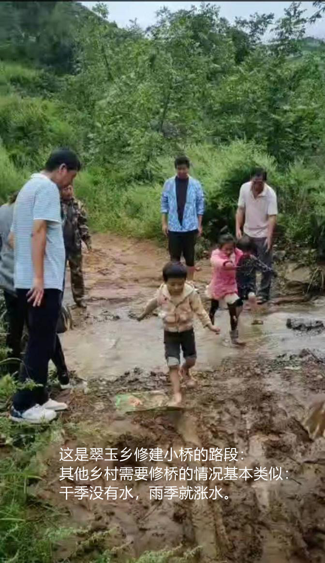 (2)小桥连建:2019年9月12日,云南省宁蒗县翠玉乡蔡家坪王家村路上小涵管堵塞,河水从路上漫过,由于水流太大,一名上学娃娃被河水冲倒,幸好被一名路过大人发现并救起。山村有很多这样的路段,或者的一个小涵管,或者就是干路,一旦遇到下大雨,就水漫路面,村民和学生通行困难或者无法通行,存在安全隐患。