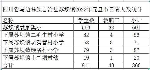 四川省马边彝族自治县苏坝镇2022年元旦慈善午宴各校人数统计:
