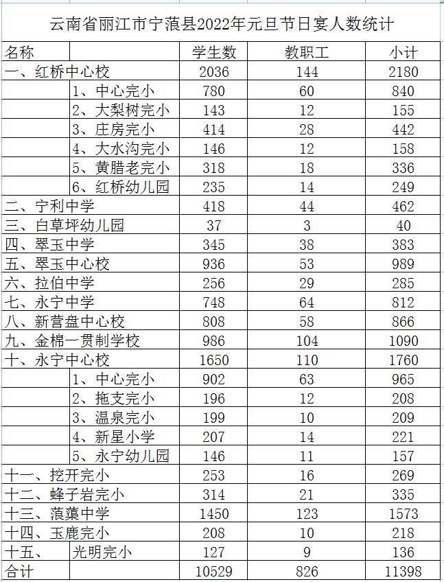 云南省丽江市宁蒗县2022年元旦慈善午宴各校人数统计