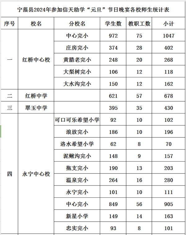 云南省丽江市宁蒗县2024年元旦节日宴会各校人数统计表: