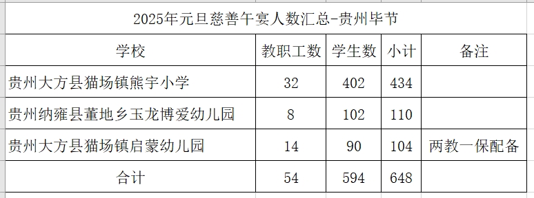 (1)贵州毕节市大方县熊宇小学和两个幼儿园:648人;20元/人,计12960元,熊宇老师负责。
