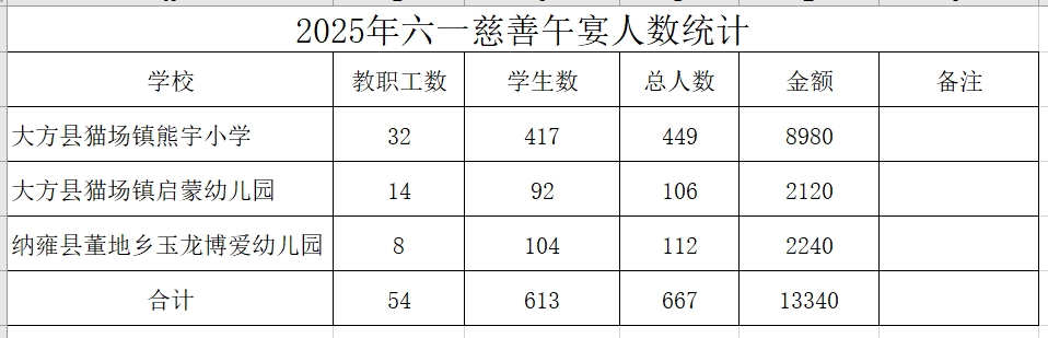(1)贵州毕节市大方县熊宇小学+两个幼儿园:667人,20元/人,计13340元,熊宇老师负责;