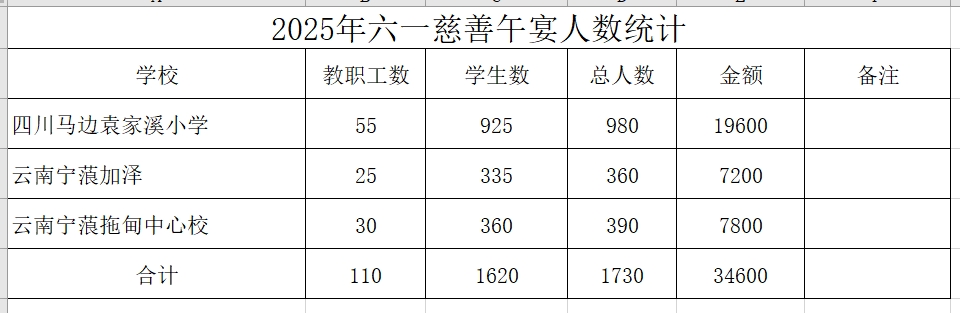 (3)四川马边县和云南宁蒗县之二:1730人,20元/人,计34600元,小蕾老师负责;