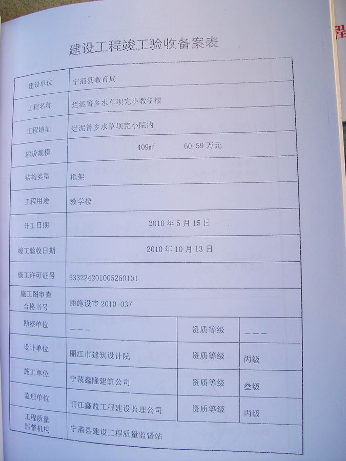 关于云南省丽江市宁蒗县烂泥箐乡水草坝完小修建文件