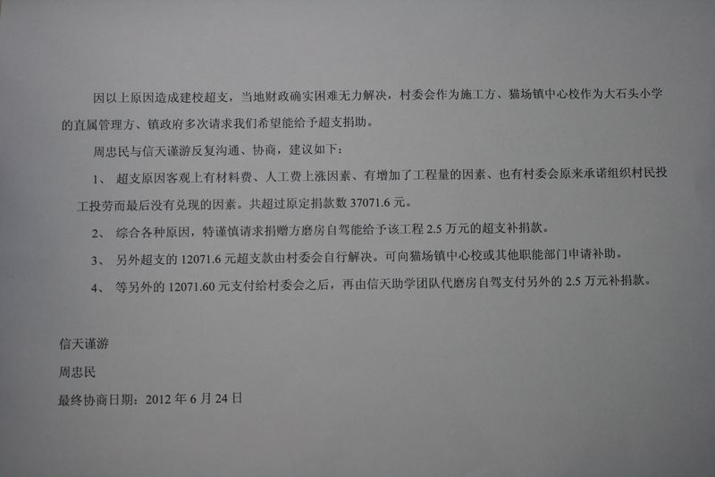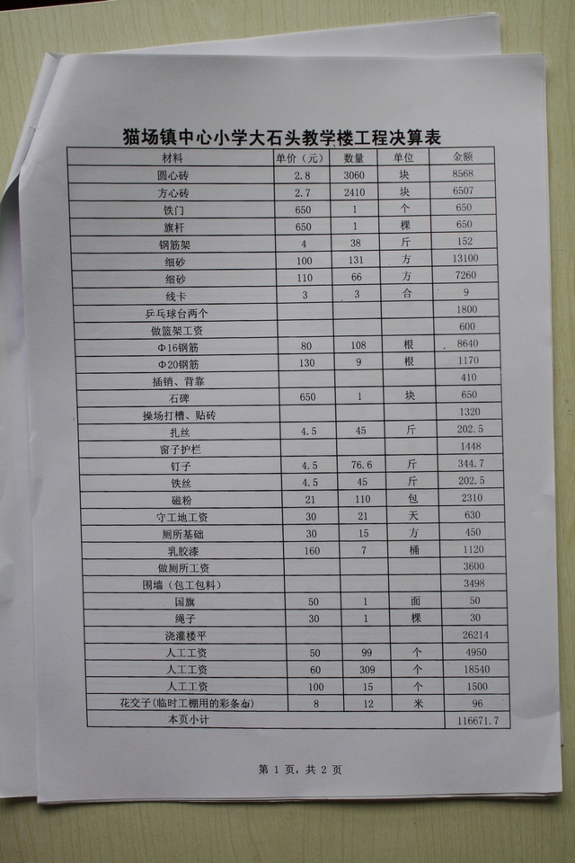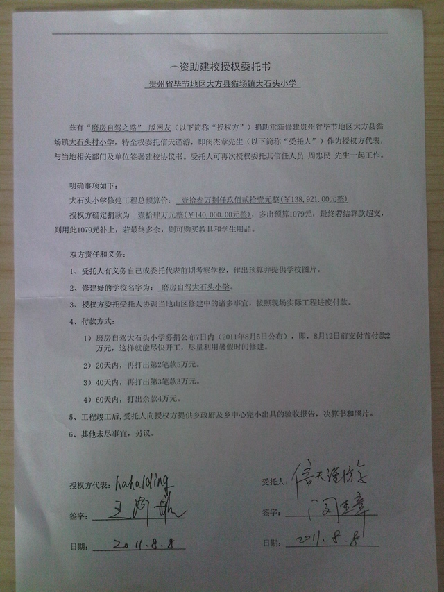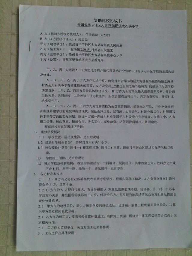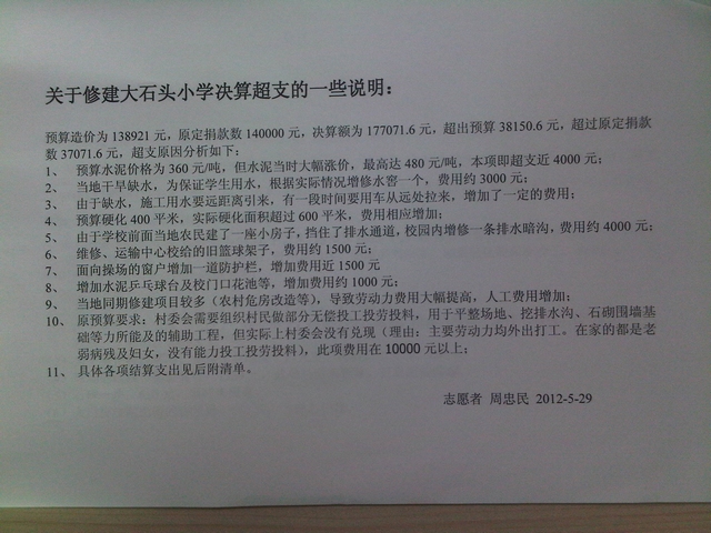 建校资金为民间捐款,需节俭珍惜使用,避免浪费,建校施工由村委会组织,非技术人员尽可能使用本村劳力