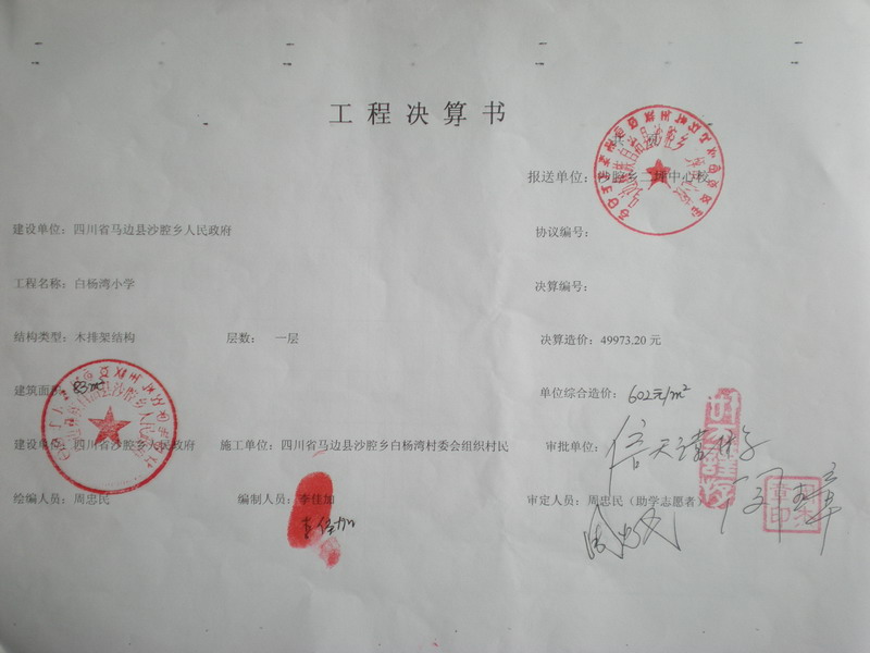 说明:预算原为12墙砖墙结构,汶川地震后,该校改为木瓦抗震结构,由于造价相当,故预算未做调整,最终依木瓦结构结算,特此说明。